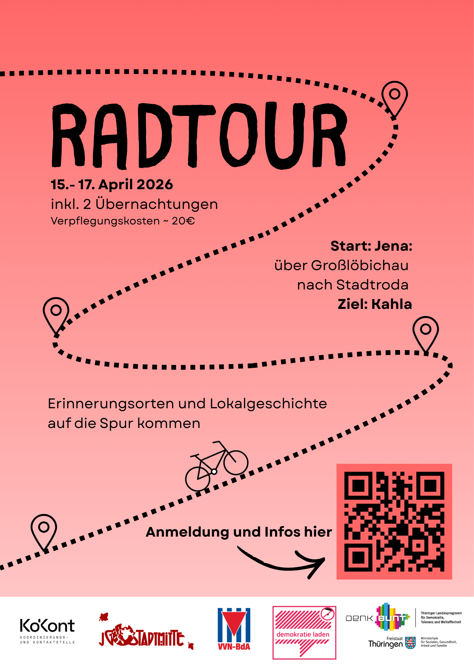 Unsere Radtour führt uns an drei Tagen zu verschiedenen Gedenkorten, Mahnmalen und Erinnerungszeichen im Saale-Holzland-Kreis. Wir machen Halt an historischen Stationen, die von Zwangsarbeit, Todesmärschen und Widerstand in der Region erzählen.